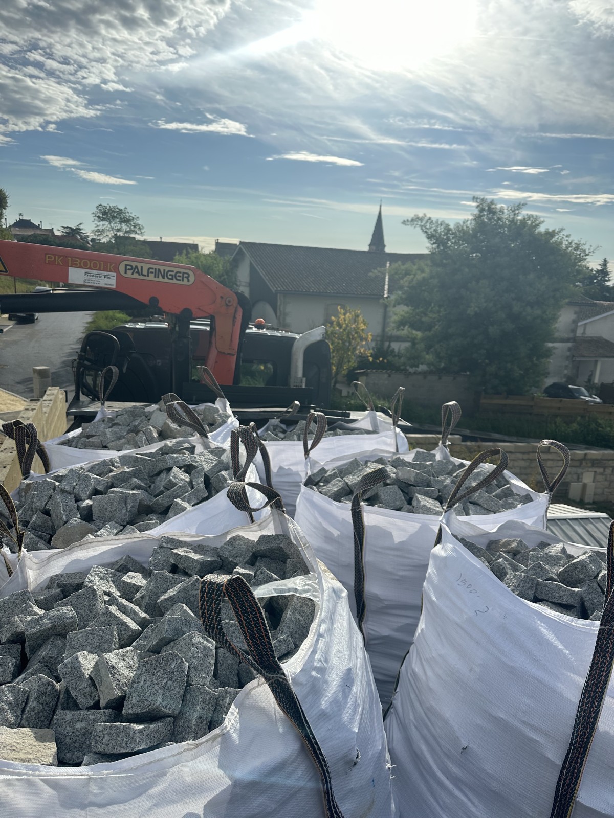 Récemment, ML Transport & Déménagement a été contacté par un client souhaitant réceptionner une livraison de pavés en granite, arrivant directement du Portugal. Ces matériaux ont été entreposés dans notre dépôt, permettant ainsi une gestion optimale de leur acheminement final. Grâce à notre camion-grue, nous avons pu livrer ces pavés sur le site de Saint-André-de-Cubzac, où il n’était pas possible de positionner un semi-remorque en raison des contraintes d’accès.